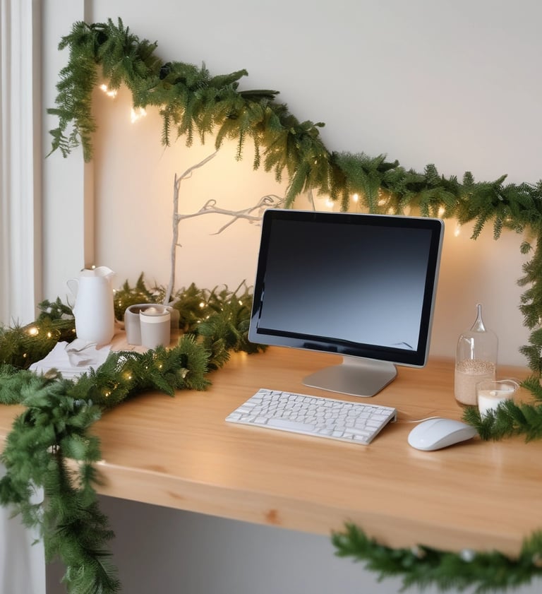 For those who want just a hint of sparkle without going overboard, a thin strand of metallic tinsel or garland is the perfect solution. Choose neutral shades like champagne, gold, or silver for a refined and classy look. You can place it along your desk edge, around your monitor, or across your cubicle wall. This simple decorative detail adds festive shine without creating clutter. It’s ideal for corporate offices, minimalists, or anyone who prefers subtle holiday decor that still feels joyful.