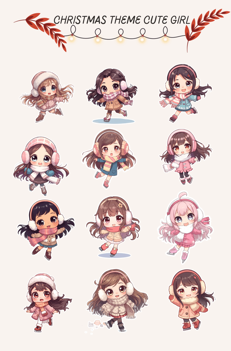 Girls in winter outfits: From cozy scarves to Santa hats, these characters add charm to every page.
